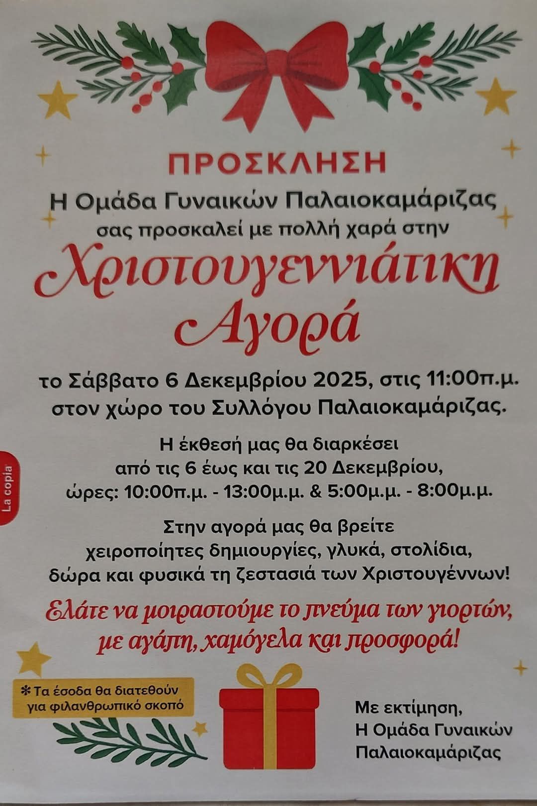 Με ιδιαίτερη χαρά σας προσκαλούμε στο καθιερωμένο ετήσιο αντάμωμα του οικισμού μας. Μια βραδιά γεμάτη ζεστασιά, γιορτινή διάθεση και όμορφες στιγμές μας περιμένει, με ζωντανή μουσική και την επίσημη τελετή αφής του χριστουγεννιάτικου δέντρου, που θα σημάνει και την έναρξη της φετινής εορταστικής περιόδου.