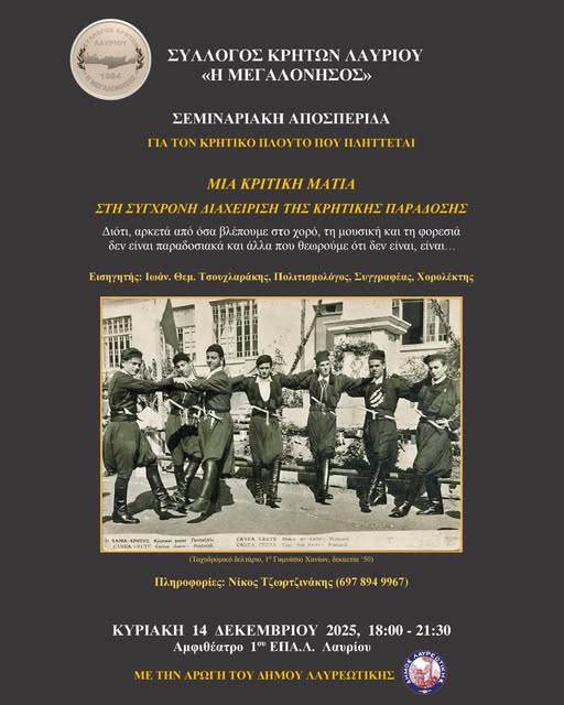 Ο Σύλλογος Κρητών Λαυρίου «Η Μεγαλόνησος» σας προσκαλεί σε μια ξεχωριστή σεμιναριακή αποσπερίδα αφιερωμένη στον κρητικό πλούτο που πλήττεται και στη σύγχρονη διαχείριση της κρητικής παράδοσης.
