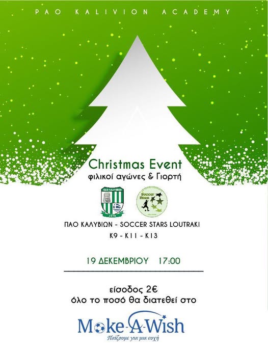 Η Ακαδημία Ποδοσφαίρου του ΠΑΟ Καλυβίων προσκαλεί μικρούς και μεγάλους στη μεγάλη Χριστουγεννιάτικη Εκδήλωση που θα πραγματοποιηθεί την Παρασκευή 19 Δεκεμβρίου, ώρα 17:00, στο γήπεδο της ομάδας.